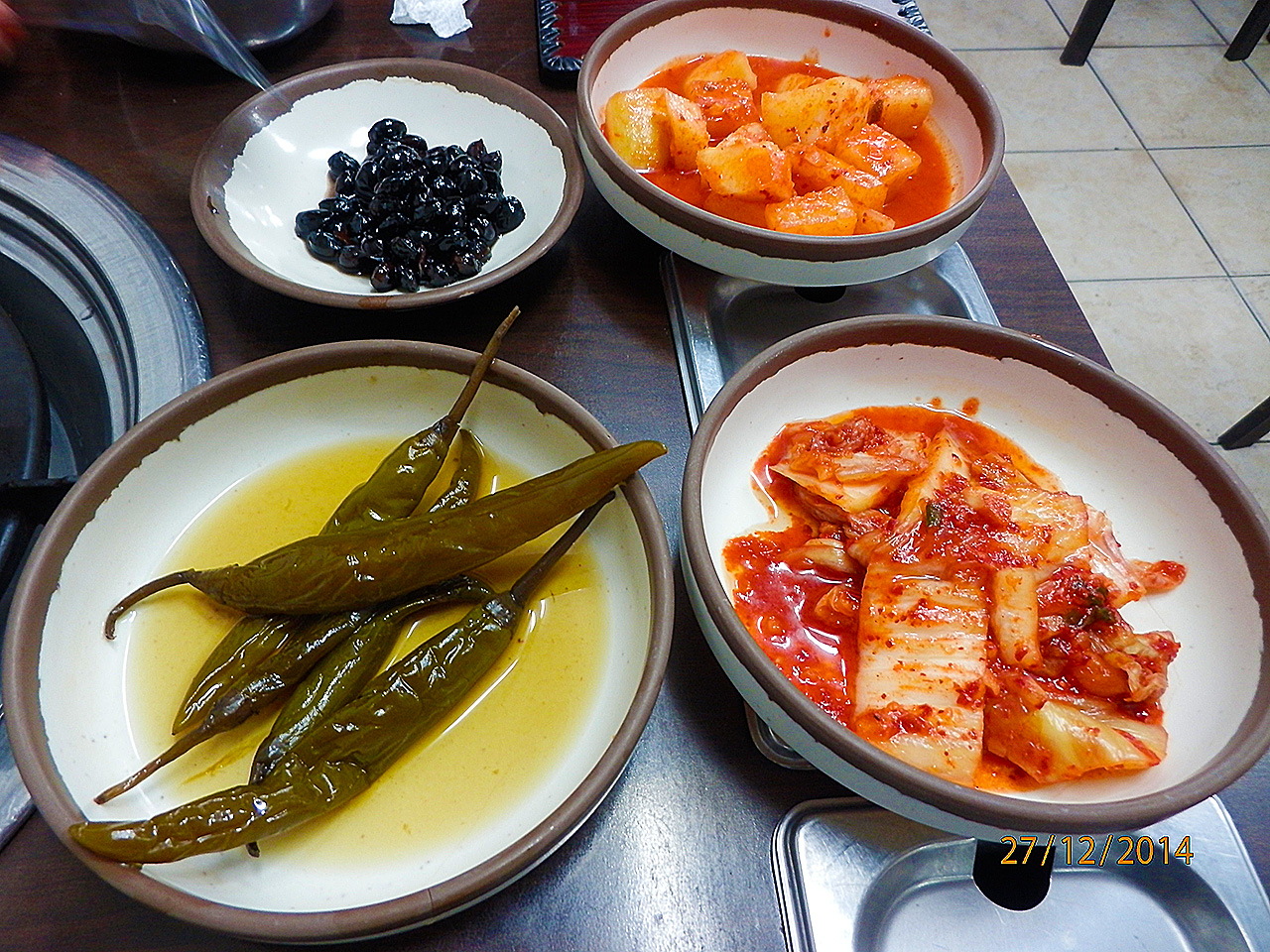 韓国の食堂でビビンバを食べた時に出されたキムチとサイドディッシュ。 豆の煮物は日本の物のほうがおいしい。 唐辛子の漬物はからすぎて食べられなかった。味もいまいち。