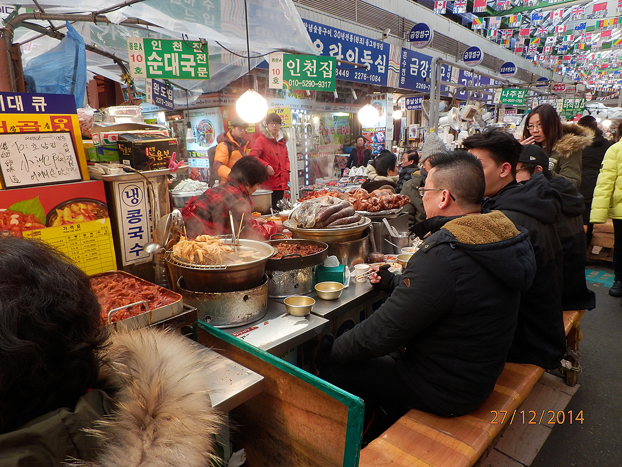 20世紀初めにできた韓国で最古の常設市場、広蔵市場。ものすごい活気。狭い屋台に人がひしめき合い、食事をとっている。