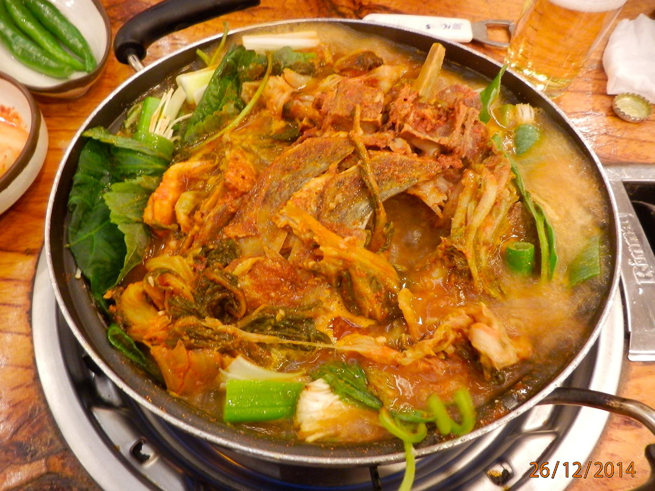 韓国で食べたカムジャタン。 骨のままの豚肉とキムチとじゃがいもを煮込んだもの。 キムチがたまらなくおいしい。