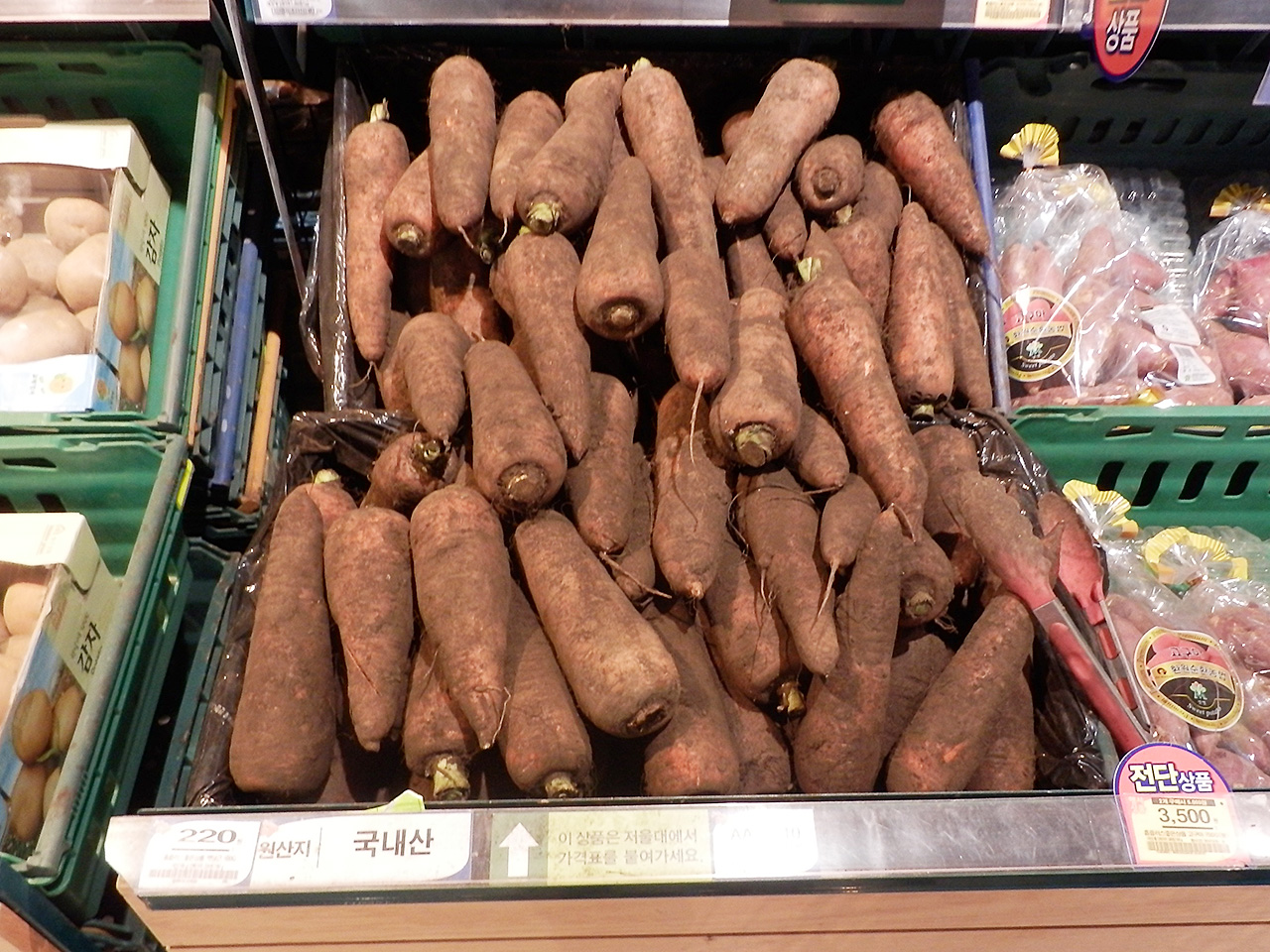 韓国のスーパーで見つけたニンジン(高麗人参ではない)。 なぜか土付き。韓国では日本のゴボウのようにニンジンは土付きのほうがウケがよいのだろうか?