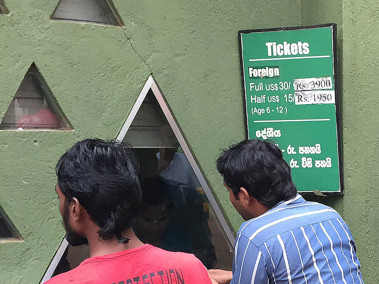 シーギリヤロックのチケットカウンター。入場料は30USドルもする。ルピーは変動するからか、手で書き換えられている。