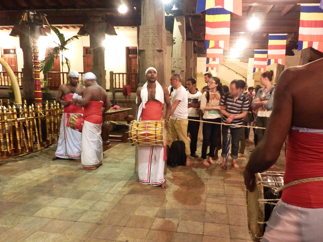 世界遺産、仏歯寺での演奏の模様。1日3回、ブッダの歯が祀られている部屋を眺めることができる礼拝時間、「プージャ」と呼ばれるイベントの時に演奏が行われるようだ。