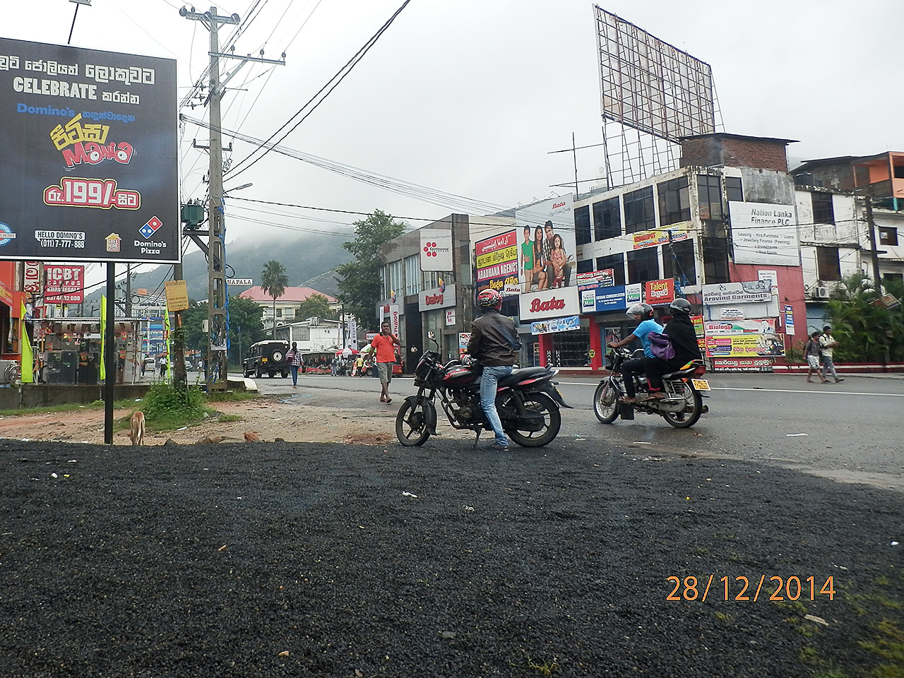 スリランカの道路は側溝があるわけではなく、雨水は流れっぱなしに成る。なので路肩が弱い。この道も、数m先は小さな池のようなものがあった。